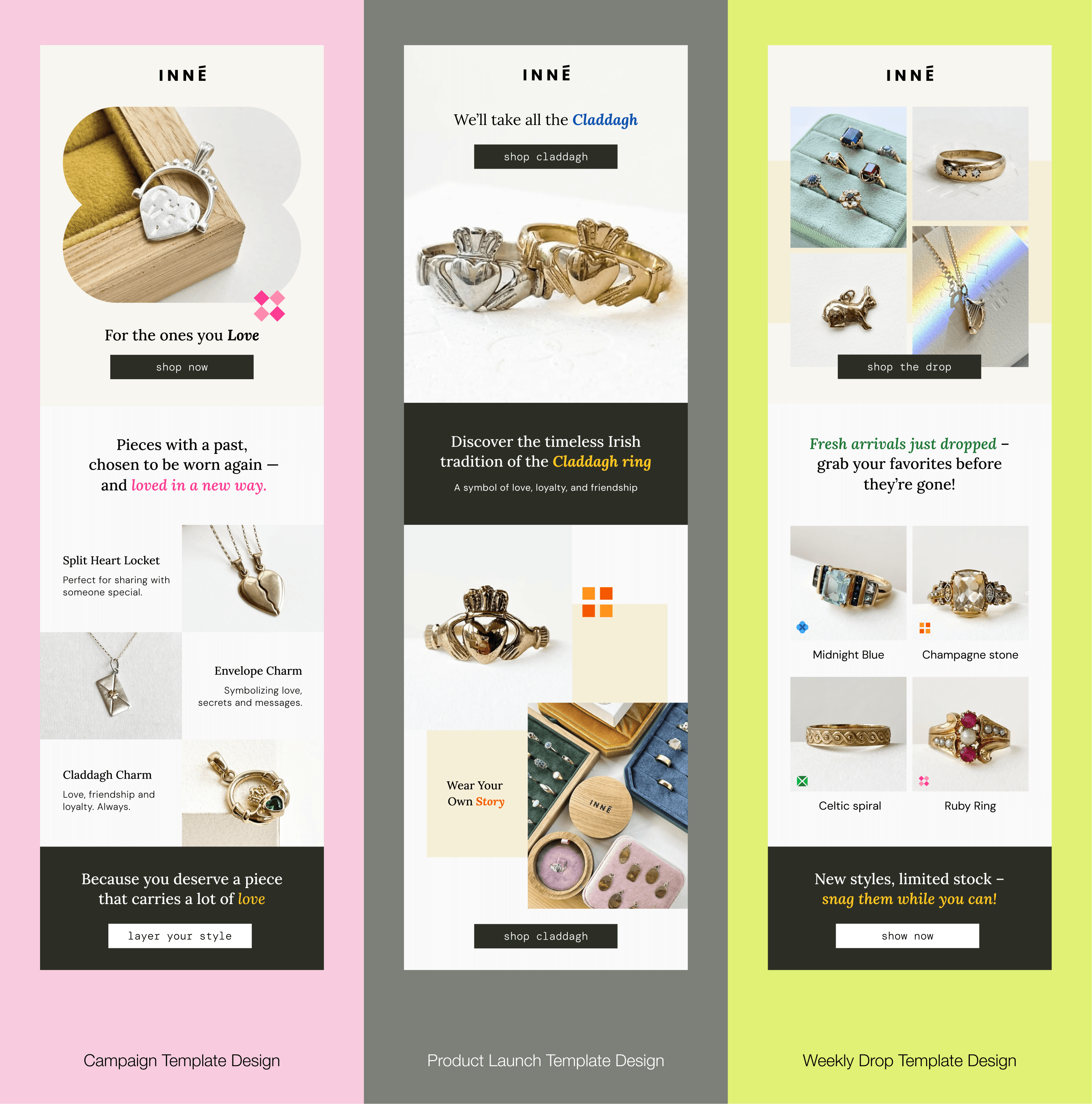 Goal: Design email templates for INNÉ to support weekly drops, product launches, and campaigns, while driving engagement and clarity.